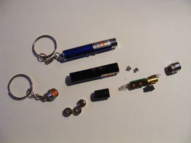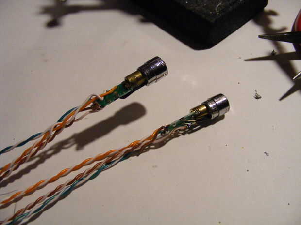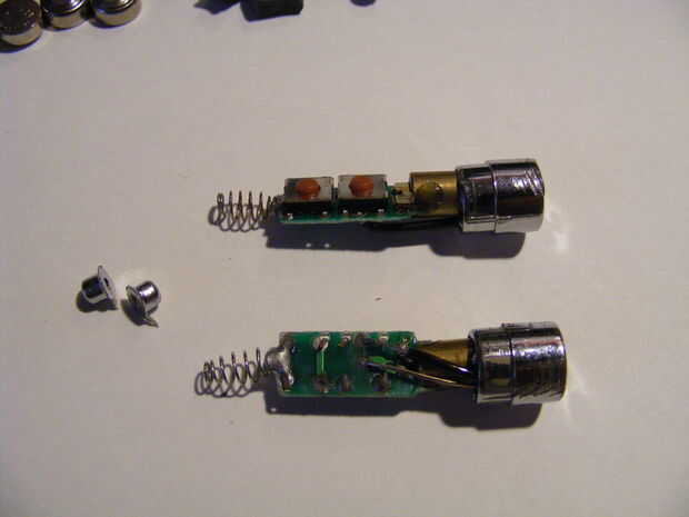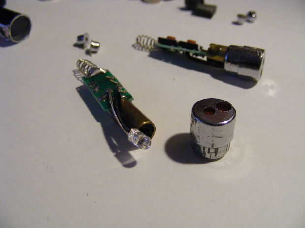 Pude sacar directamente los siguientes módulos de dos láser. Tienes que pulsar las tapas de botón en el tubo para que se deslice hacia afuera con la placa de circuito.