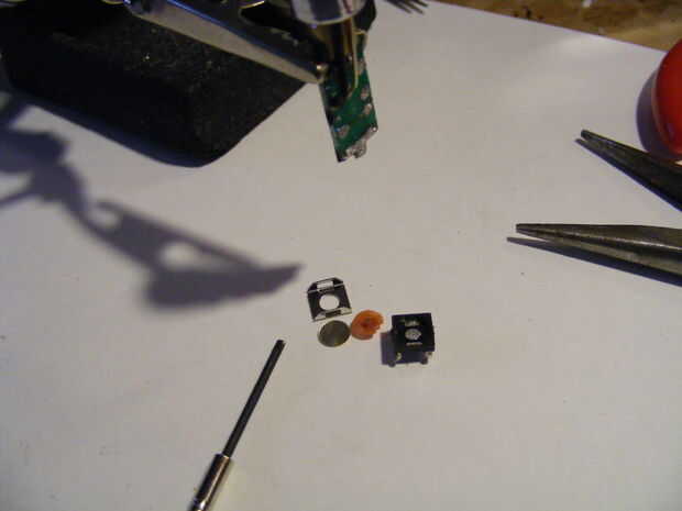 Había intentado de desoldar un interruptor táctil agarrándolos con alicates de punta delgada. Tiré el interruptor aparte agarrando el camino equivocado. Bueno pude poner juntos. Electrónica barata tiene partes baratas. La calidad de la soldadura las mercancías de importación barato uso es atroz y real duro salir limpiamente. Aplicar demasiado calor y los rastros de circuito tirón del tablero. Ir tan fácil en la fase de demolición.