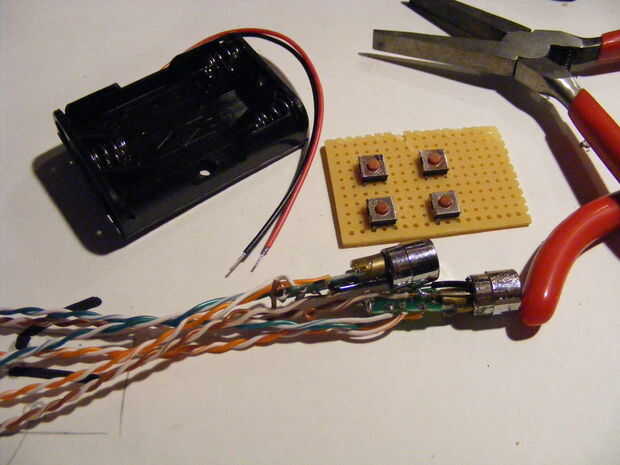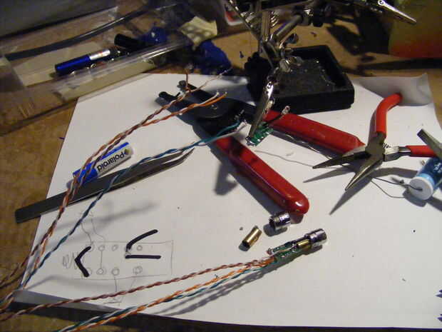 Cable de la batería a los cables de alimentación de los punteros láser. Conecte los punteros láser en paralelo por lo que se alimentan de la batería uno.