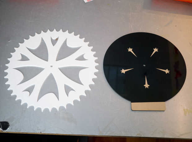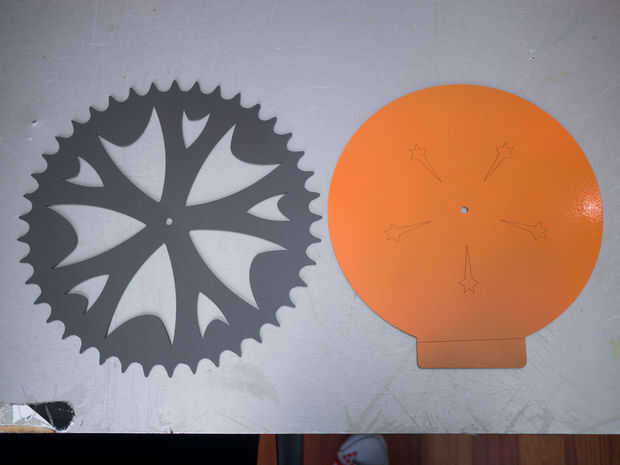 Se compone de dos capas de acrílico de 1/8". La capa superior es de acrílico blanco y se pintó con Krylon carbón gris martillado óxido Protector final. La capa inferior es de acrílico negro y se pintó con Krylon Dual mandarina. El movimiento del reloj es un movimiento de barrido suave y vino de Klockit.