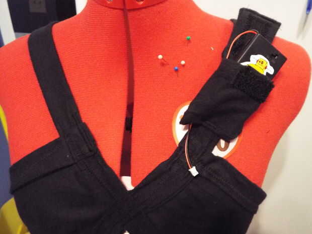 El arduino Adafruit Flora será propulsado por una batería. Hice un bolsillo para sostener el soporte de la batería. El cable de alimentación pasa a través de la parte inferior. El bolsillo tiene una solapa de velcro para que pueda llegar hasta el interruptor y retire la unidad para cambiar las baterías.