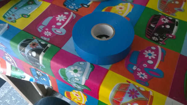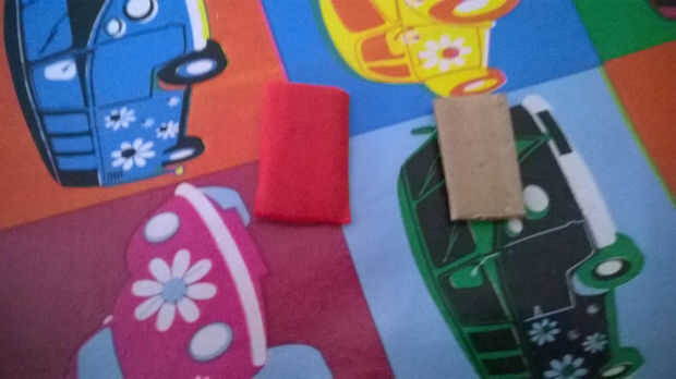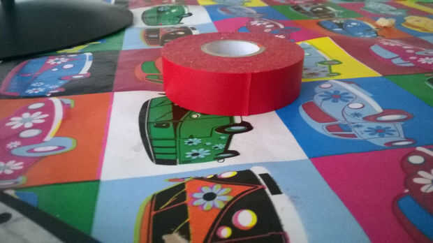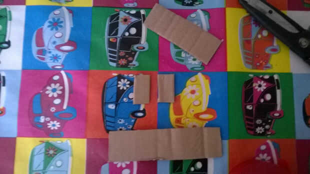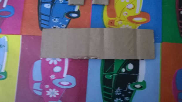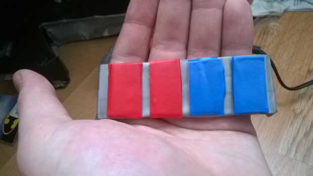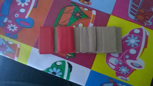Corte una tira de cartón de 4cm de largo y 1cm hacia arriba y poner esa tira hacia un lado. Corte otra tira de la misma longitud y altura, luego cortar tiras de 0,5 cm y 1cm hacia arriba, usted querrá hacen de 4 tiras de esta, usando la cinta, dos rojos y dos azules, entonces que primero le tira corta, la tira de 4X1cm, hacer esa plata.