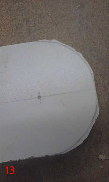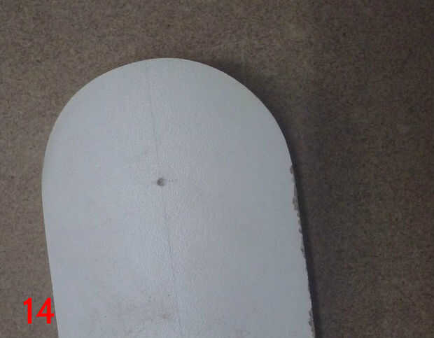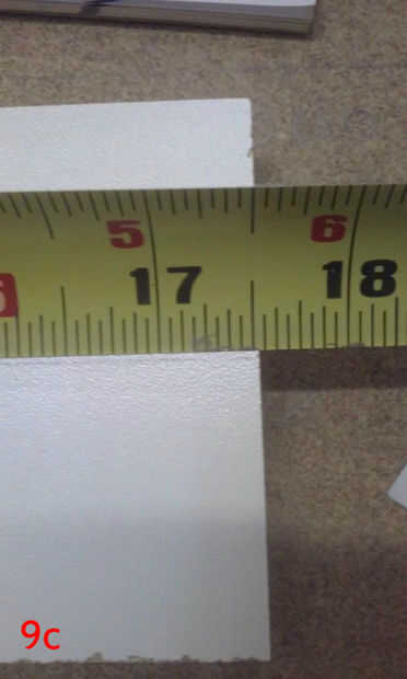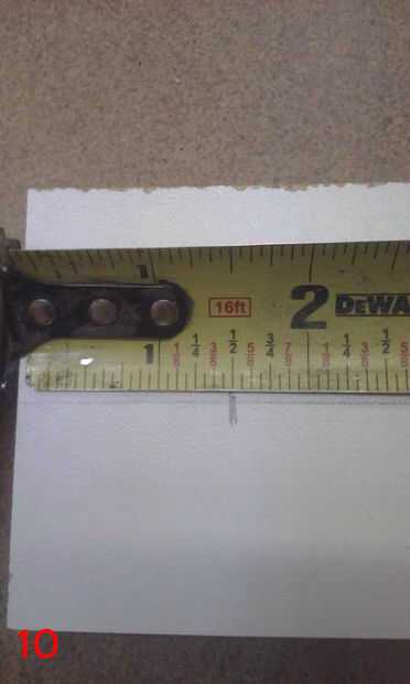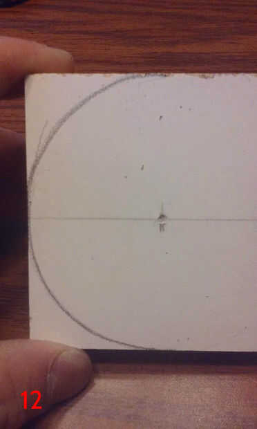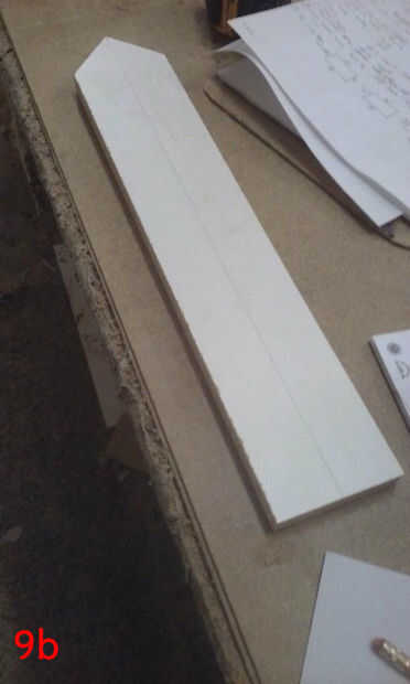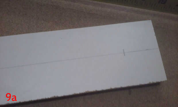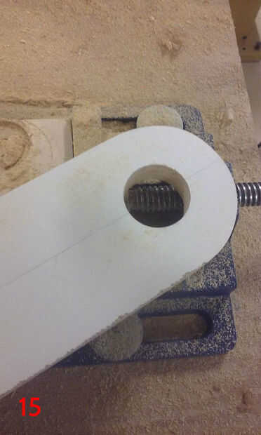El refuerzo superior se hizo de cuatro 3" piezas anchas de 3/4" espesor abedul Báltico madera contrachapada * en 16 de 17/32" de longitud (corté las piezas de gran tamaño 6 pulgadas a lo largo). Se cortó una ranura de 3/4" 1/4" fondo fue el centro de cada longitud (1) y luego un extremo inglete a ambos lados de cada pieza. Para cortar el inglete, puse la parada en la Sierra de cortar para que la pieza seguiría siendo de gran tamaño después de que ambos fueran a inglete (2). Hizo el primer corte (3), volcó la pieza (4) y luego hizo el segundo corte (5) - dejando una mitra agradable, centrada. Después fue cortado el inglete, había medido en 1 1/2" desde el borde largo en el extremo unmitered y hacer una marca (6). Entonces dibujé una línea de esta marca para el centro del punto a inglete (7). Con esta línea de centro, medido hacia fuera 16 17/32" de la punta de la Mitre, asegurándose de que quemar una pulgada (8a, 8b). Cuando se quema una pulgada (midiendo desde la marca 1" en lugar de la ficha estándar de la cinta métrica), la medición en la cinta debe ser 1" más grande que la medida deseada (en este caso medimos 17 17/32" en lugar de 16 17/32" a causa de la pulgada omite). Una vez que la longitud se midió hacia fuera, hice una marca y cortar el trozo final (9a, 9b, 9c). Desde aquí me mide hacia abajo la línea de centro 1 1/2" desde el borde corto del unmitered final y hace una marca (10). I centro de perforado donde esta marca y la línea central atravesada (11) y luego utilizan un compás a un radio de 1 1/2" para dibujar el radio (12). I áspero cortar el radio de la sierra (13) y luego lijar bien para la línea de la lijadora de banda (14). Una vez que la radio fue hecho, usé la marca del punzón como el centro para el orificio de entrada de hoja de sable de luz. El agujero fue perforado hacia fuera con un 1 1/4" forstner bit usando una prensa del taladro (15). le recomiendo usar un taladro para taladrar en este proyecto, como alineación vertical es de suma importancia. Repita este proceso tres veces más y tendrás todas las piezas para el arriostramiento superior.