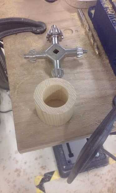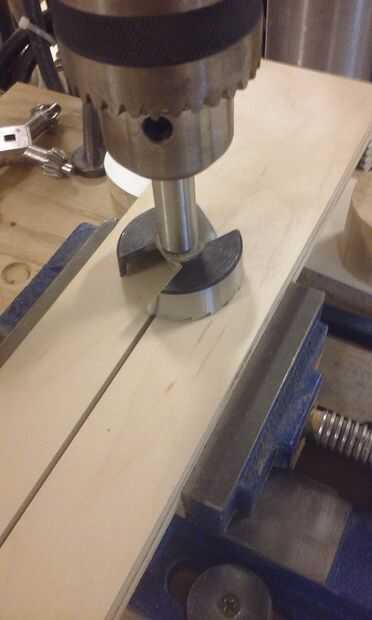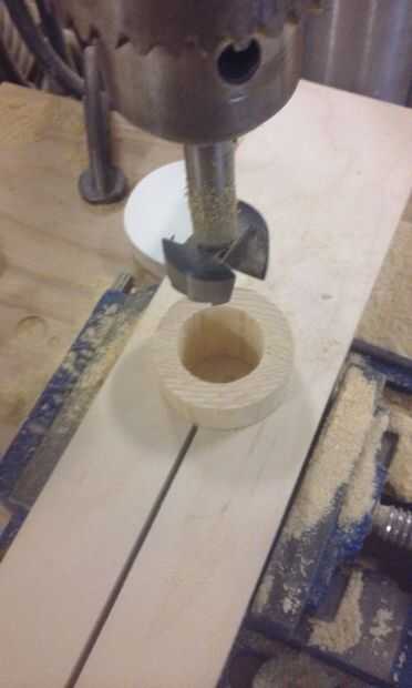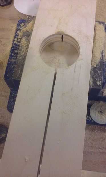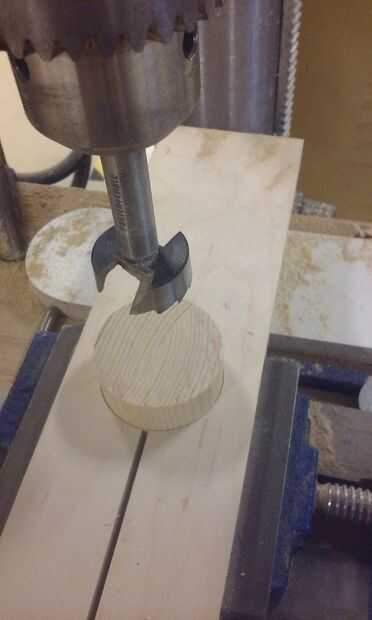 Las tapas se hacen de un taco de madera de pino de 2"(comprado en Home Depot aquí) cortada en cuatro tiras de 1 1/2". Había aburrido un agujero de 1 1/4" a través del centro en el extremo de cada casquillo de extremo, usando una plantilla que hice y un 1 1/4" forstner bit. La plantilla es una 3 1/8" pieza de chatarra con un 1/8" corte por la mitad sobre hasta la mitad. Taladré un agujero de 2" con un 2" forstner poco (ya que el diámetro de los casquillos de extremo 2") en el corte 1/8". Este corte actúa como un dispositivo de sujeción cuando se pone el tapón en el agujero de 2". Después de que el agujero fue perforado, cambié el 2" poco para un 1 1/4" bits y colocado el tapón 2" en el agujero, todo sin mover el jig. Sujeta la plantilla alrededor de la tapa apretando los lados con la mordaza y taladrar el orificio de 1 1/4".