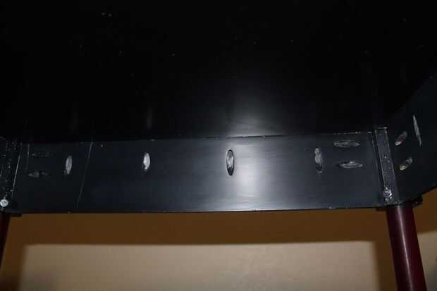 Para montaje con abrazadera del poste de la esquina a la mesa de trabajo, el delantal al Banco de trabajo (con un espaciador de 1/2" debajo de él) y funcionó una abrazadera de un extremo de la plataforma hacia el exterior del poste de la esquina, las dos piezas de sujeción a. Luego bolsillo atornilladas a las piezas. Repetí esto hasta la sección entera como montado. NO pegan las piezas, como fueron pintados separados. Desmonté la Asamblea (después de que fue puesto para arriba en la parte inferior de la tapa de tabla. Vea el paso siguiente). y escribí números de registro en el extremo de cada faldón y en cada poste de la esquina donde fue el delantal, para agujeros preparar durante el montaje final más adelante.