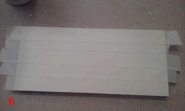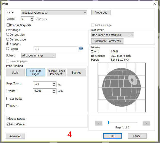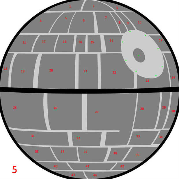 La plantilla para el diseño de la estrella de la muerte se hizo utilizando Inkscape. He exportado el archivo a formato pdf (incluido aquí) e impreso el pdf utilizando Foxit Reader, Foxit Reader permite para imprimir azulejos a escala completa. I definir los parámetros de zoom de 100%, sin superposición, auto rotar y centro y baldosa de impresión (4). Una vez que las páginas fueron impresas (terminé con 20 páginas), recorte la plantilla (yo corte la plantilla entera, no los paneles individuales - que viene más adelante) y con cinta los bordes para formar una plantilla completa. Cada uno de los paneles, contados a partir de la parte superior izquierda, va derecho y entonces a partir la izquierda con cada nueva fila (5). Debe haber 44 paneles en total.