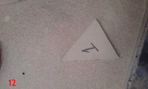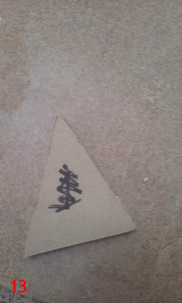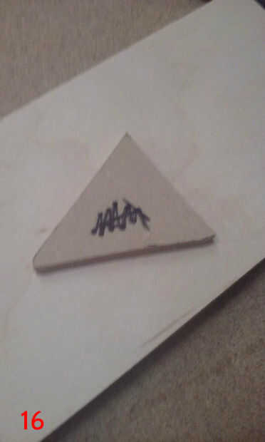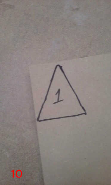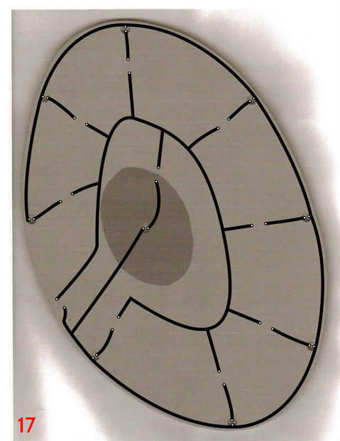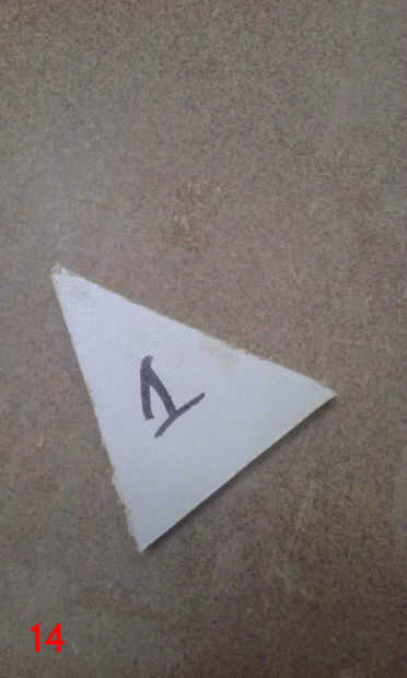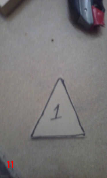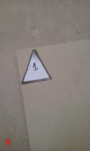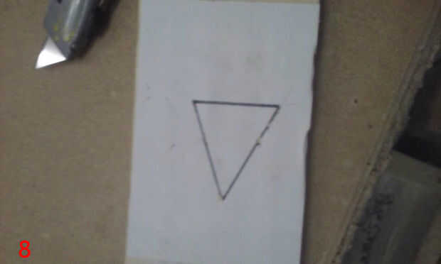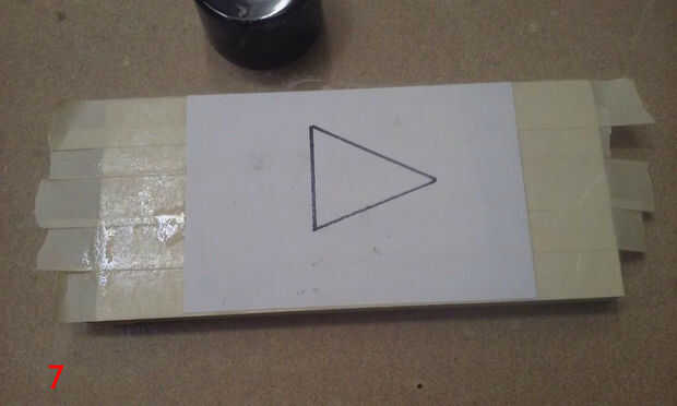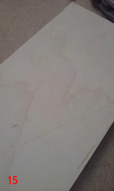 Para poner la plantilla para arriba sobre la mesa, primero grabado sobre toda la tabla superior con cinta de enmascarar de 3". Luego usé el orificio central que perforado anteriormente y un compás improvisado (hecho de un clavo de acabado, algunos restos de madera y un lápiz) situado a un radio de 17 1/2" para dibujar un círculo de 35" en la cinta de enmascarar. Esto sería los confines de la plantilla. La plantilla se dibuja a 35" de diámetro, por lo que el tablero terminado tendrán 1/2" saliente todo. He utilizado adhesivo en aerosol para fijar la plantilla a la cinta de la parte superior. Una vez que la plantilla fue adherida a la cinta, usé un cuchillo X-acto para cortar alrededor de cada panel individual del diseño estrella de la muerte, asegurándose de que al excavar en profundidad, como las líneas de corte en la parte superior sirven como guías de borde más adelante cuando los paneles estaban siendo pegados en. Corte el óvalo de super laser, porque el circuito del LED está empotrado en la parte superior de la tapa de tabla y cubierta por un panel de 1/4"(el óvalo de super laser). Una vez que terminé de corte alrededor de cada panel y el óvalo de super laser, peladas cada trozo de panel, asegurándose de conservar la cinta y había pegado sobre un mdf de 1/4". Había trazado alrededor de cada pieza del panel en mdf y escribió el número correspondiente en el mdf también. Después bruto cortar los paneles en la sierra y arena a tamaño de la lijadora de banda. Una vez que se recortan los paneles, rayar el número en la cara y escribir en la parte posterior. Así se podrá decir qué número panel es después de lijado y pintura. (Todo este proceso si cubre en fotos 6-16, con la forma de un triángulo).