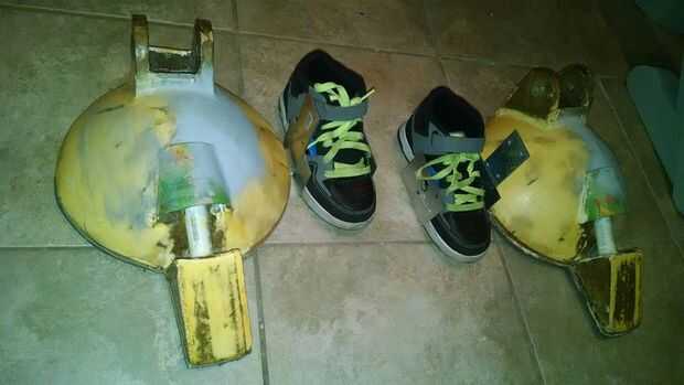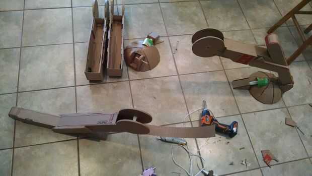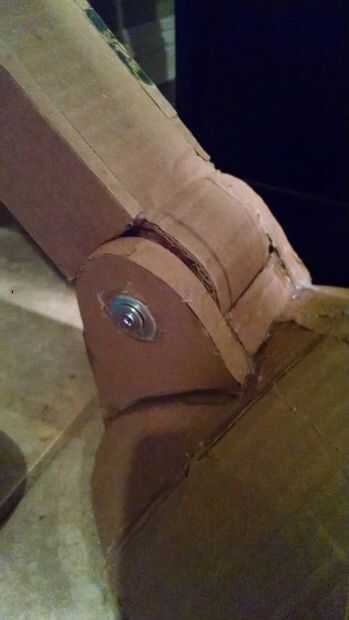 Empezar a medir y a cortar para darle las formas que ves en la pantalla del ordenador. Y cierta interpretación de la artista es porque también existen versiones y diferentes fotos. No tiene que ser perfecto! Usar tacos de madera para los pivotes, sólo asomó un agujero en el cartón y colocar un tornillo al final. También hice las cubiertas de los pivotes para que no ver cabezas de los tornillos. Mira las fotos y buscar en el ordenador para las formas. Incluso si las cabezas de tornillo visto estoy seguro que su multa. Es la última gran cosa... Encontrar una manera de enganchar los pies de los caminantes para unos zapatos y se camina con los pies de los portadores. Usé algunos lazos de simpson en The home depot.