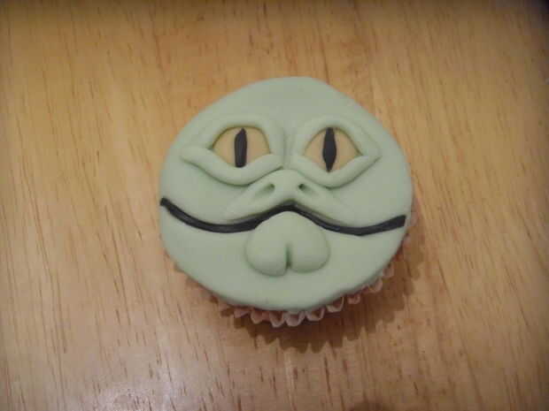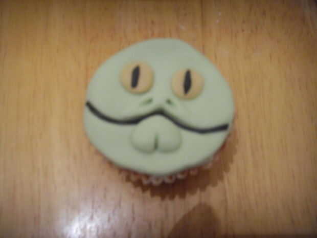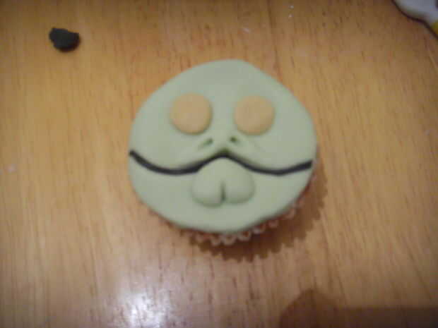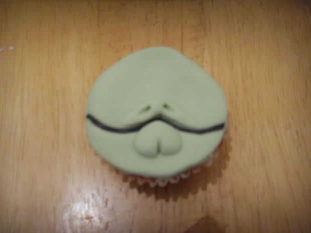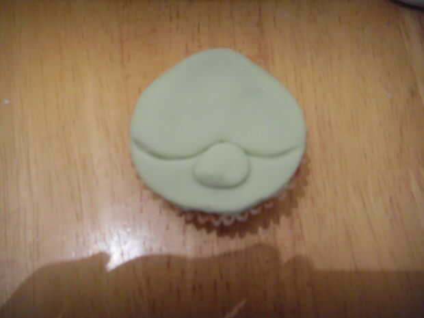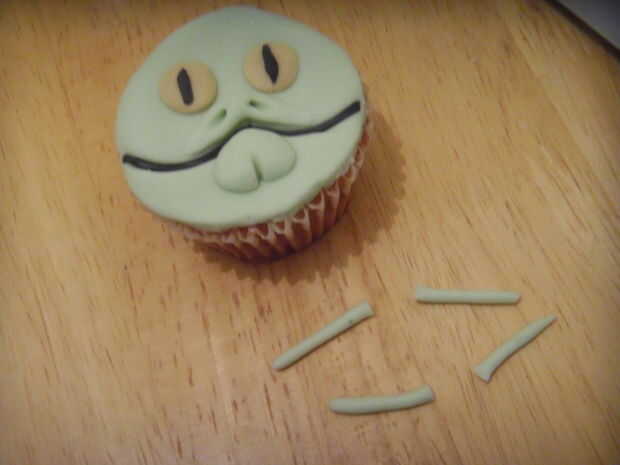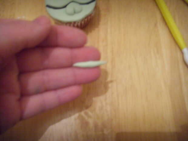 Rodar una bola de luz verde y aplanarla para que tenga una punta ligeramente. Pegar esto en como la barbilla. Un largo y fino embutido negro del rodillo, rellena la boca con él.