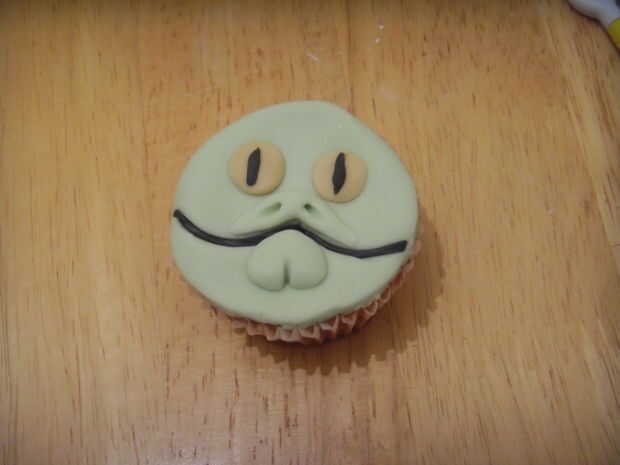 Rollo de 2 bolas amarillas como ojos. Les aplaste a la torta.