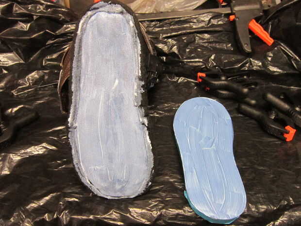 Una vez caliente la suela de goma, usé un pincel de espuma para aplicar una buena capa gruesa de cemento de contacto a la parte superior de la suela y la parte inferior de la parte superior de la bota. Había aplicado el pegamento a un zapato en un momento así el cemento de contacto quedaría pegajoso y presiona las suelas y capelladas juntos.