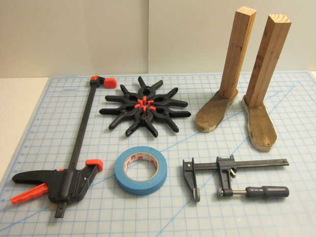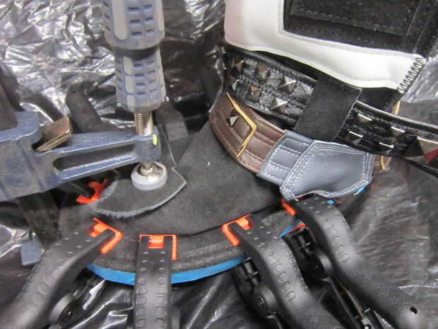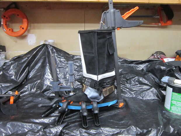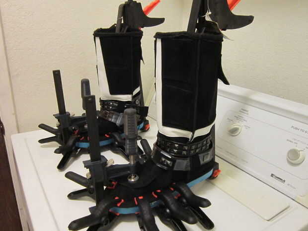 Una vez que las suelas y capelladas se pegan comencé el proceso de fijación para asegurarse de que todo me alojé en el lugar. Utilicé madera pies formas presionando mientras seca el cemento de contacto. Recluté a alguna ayuda para esta parte; ) . Se crearon de una pieza de 2 x 2 para las piernas y un pedazo de 1 x 4 para los pies. Una vez insertadas las piernas de madera vinieron justo en el borde superior de las botas y pude fijar abajo con una pinza larga.