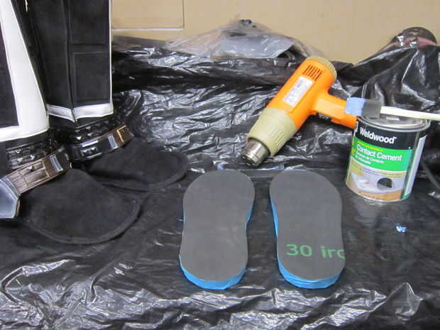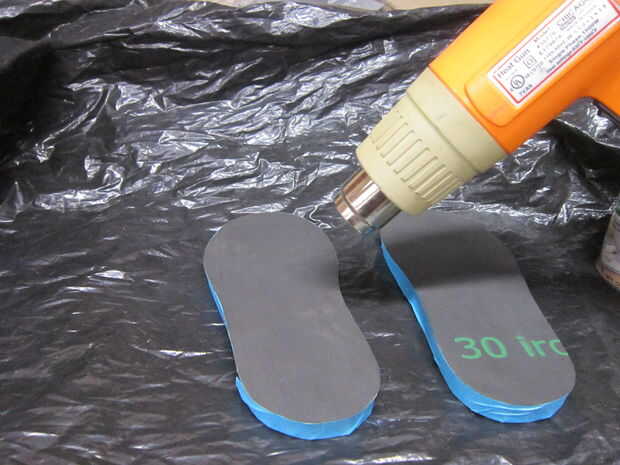 A continuación empecé a calentar la suela de goma con una pistola de calor. El cemento de contacto se adhiere mejor en un ambiente cálido y en las superficies calientes.