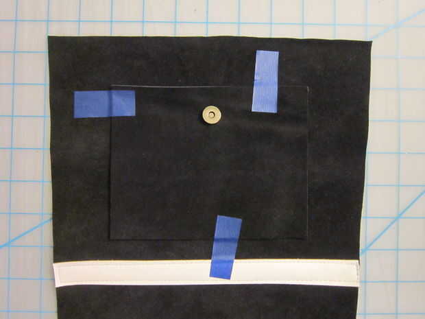 He colocado el bolsillo en la pieza de arranque trasero y utiliza cinta de pintor para mantener en su lugar mientras se cose. Clips de carpeta no funcionan aquí puesto que no eran lo suficientemente largos para llegar a la posición.