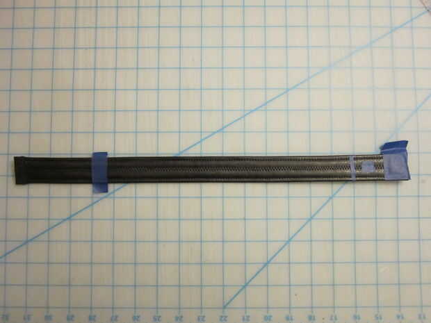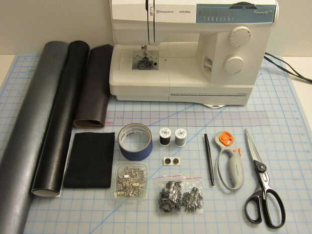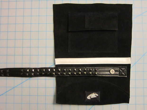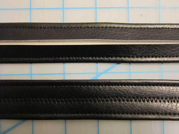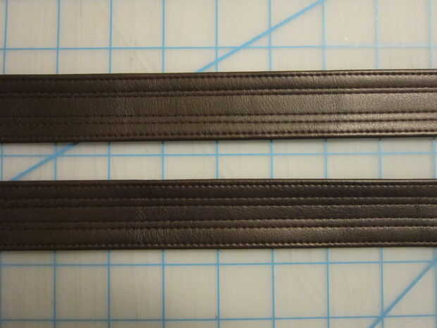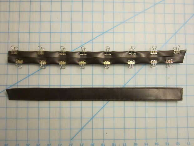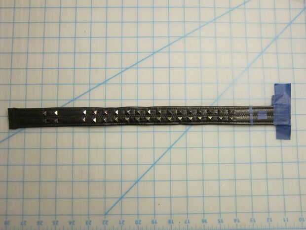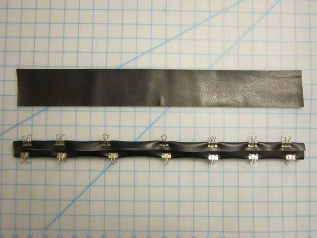 Para la correa superior solía una regla marcar una franja en cuero vinilo negro bastante tiempo el abrigo alrededor de la bota y recortar con una cuchilla giratoria.