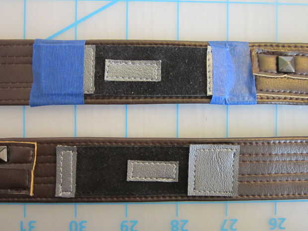 Para crear la correa inferior he utilizado el el mismo proceso que la correa superior, esta vez utilizando vinilo marrón cuero. Una vez cosido empecé añadiendo detalles para imitar cinturón de utilidad de Han Solo. He añadido pequeños parches para parecerse a los bolsillos y una falsa Lightsabar con unos detalles de postes a lo largo.