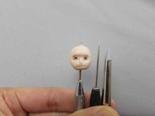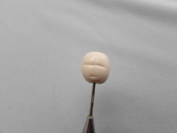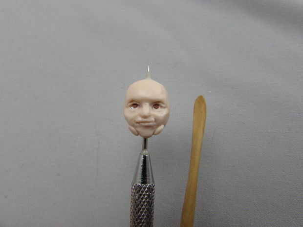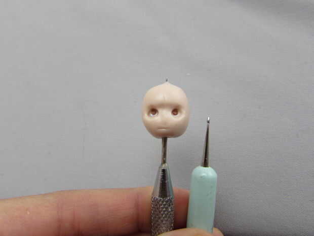Me empieza con una pieza de forma oblonga y marcar las líneas horizontales de los ojos, nariz y boca. A continuación, una línea media vertical que me ayude a ser simétrica con ambos lados de la cara. Usé una aguja de bola para aplicar sangría a los zócalos de 2 pequeñas redondas blancas piezas de barro para los ojos y 2 piezas marrón aún más pequeño para el iris. Luego con una herramienta de la aguja, dibujé los párpados superiores.