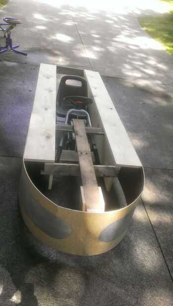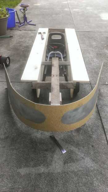 Con los travesaños, crear una estructura horizontal que sobresale hacia adelante para apoyar la cubierta en el frente, que tiene un miembro vertical que se acerca a la tierra. el miembro vertical será la base para la falda de lado arqueado. Faldas/cuerpo, tenía una pila de paneles baratos que se dejaron en el garaje. tiene un muy años 70 madera impreso en la parte delantera. como se puede ver es bastante flexible. Esta es una foto de deconstrucción para que la falda tiene parte de la memoria en forma. comenzó bastante recto. primero fijar el centro de la falda al miembro vertical para que desde arriba la cosa entera se ve como una gran "T". En el transcurso de 2 o 3 días, solía correas del trinquete Tire lentamente en las "alas" de la falda hasta que pude sujetar a las estructuras de la plataforma a cada lado. Este paso parecido una ballesta grande como el radio de la nariz se desarrolló lentamente.
