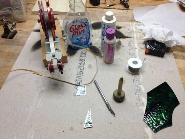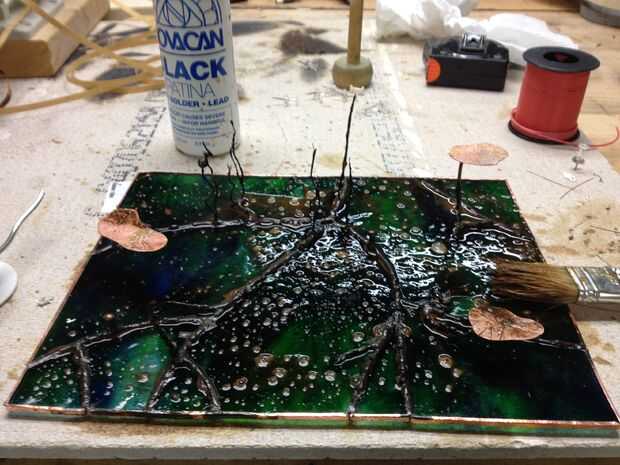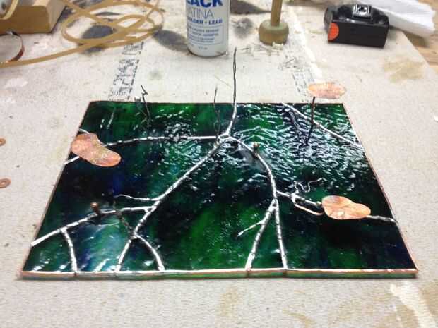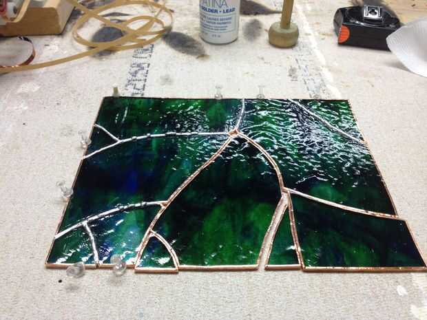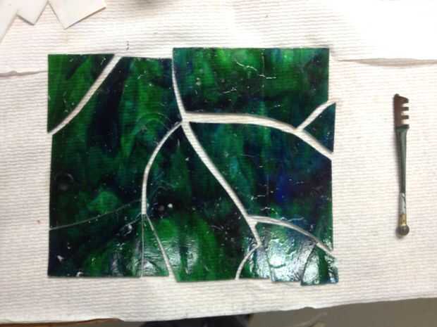 Cortar el vidrio, más abajo en pedazos en un patrón para la escena. Usé las curvas para imitar el pantano las raíces de un árbol de crecimiento de las plantas. Después de cortar el vidrio, usar un cristal o una amoladora y limpiar / Plaza los bordes del vidrio. Esto es importante ya que ayuda a la hoja a adherirse al borde y mantiene cuadrados de dimensión uniforme en ambos lados del vidrio.