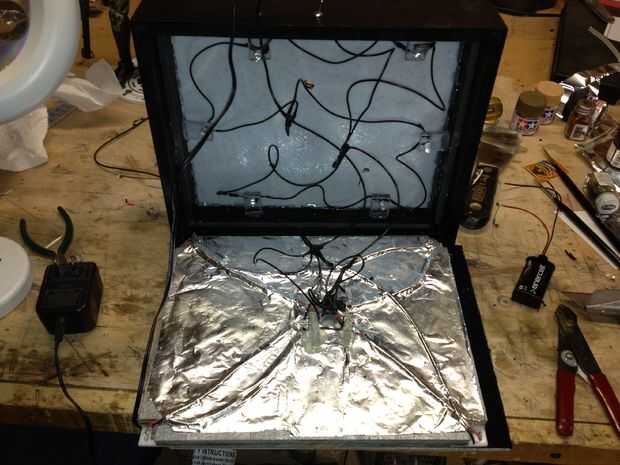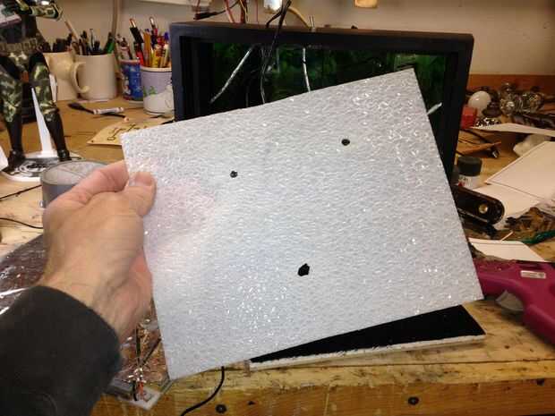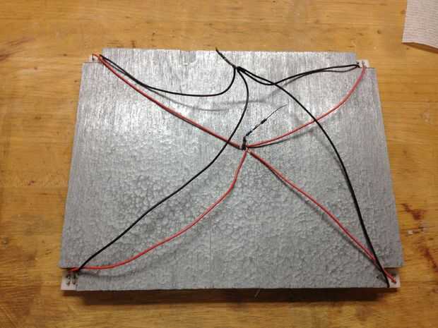 Cortar un tablero de madera contrachapada gruesa de 1/2" o material similar, la parte posterior de la estructura y diseño de su circuito para la iluminación de las restricciones. Pintura plata para ayudar a reflejar la luz hacia arriba a través del vidrio. Terminé el tablero con papel de aluminio para máxima reflectividad de la guarnición.
