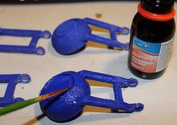 Me gustaria fortalecer mis impresiones y pegan todos los hilos sueltos hacia abajo por la pintura con acetona. Esto se vende en farmacias para quitar clavos adhesivos. A veces tienes que pedirla. Es 100% acetona. Removedor de esmalte de uñas no es el mismo ya que es una mezcla de acetona y agua.
