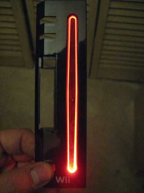 También fue un paso simple. Tuve un l.e.d. de alta intensidad rojo y archivado en ambos lados para hacerla plana. También presentó la barita de luz hacia abajo para aceptar el diodo emisor de luz, entonces les ajustaron juntos. Sólo corte el conector y soldar en el diodo emisor de luz ya que la resistencia está ya en la Wii. Eso es él!