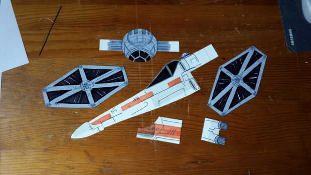 Una vez que se recortan las piezas, proxeneta a cabo con cualquier medio de colorear te tenga a su alcance. Usé algunos marcadores sharpie y lápices de colores, por lo que no necesitará ir loco con herramientas. Yo sólo busqué en Google algunas imágenes y películas de imágenes fijas de referencia, pero por otra, es tu propio proyecto! personalizarlos a tu gusto. Mientras se realizan los cazas TIE, fui adelante y trabajó en algunas piezas decorativas para el X-Wing. Echa un vistazo Fig.3 para referencia si es necesario.