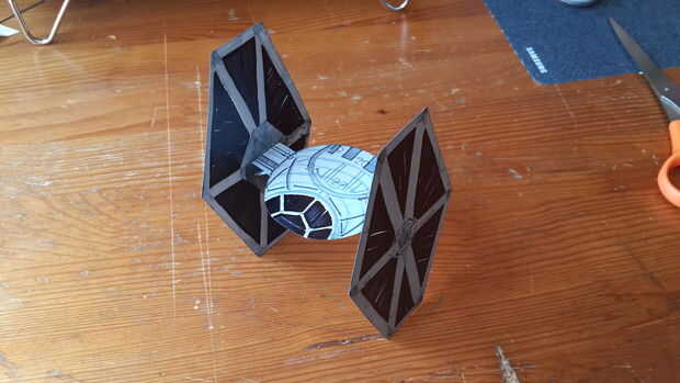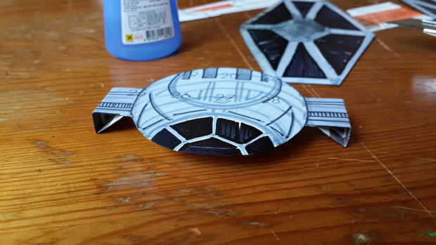 Verás que he dejado fuera algunas fichas blancas en los lados de los cazas TIE. Las aletas laterales se dobla hacia adentro para ayudar a pegar los lados hexagonales. Ver Fig.4 para referencia. El pegamento de los hexágonos en y su TIE Fighter al lado del parque. Termine con el TIE Fighter.