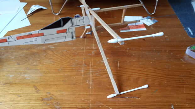 Mientras que el TIE Fighter es secar, seguir adelante y tome el cuatro Q-tips (o palillos) y pegamento a cada uno de los extremos de las alas de X-Wing como ves en la Fig.5. Estos se necesitan apoyar la "piel" del ala, así, así que asegúrate de que eres generoso con el pegamento en estos. Estás tan cerca de la línea de meta ahora.