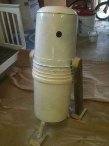 6. luego hice las piernas y los pies, aseguró las piernas al lugar fueron el mango de la tapa cubo era originalmente. Así que corté las piernas a esa altura. Solo tengo un poco de habilidad VI así redondeando la parte superior y la pesca fue fácil, pero eran difíciles de líneas rectas.