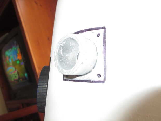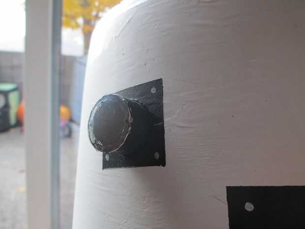 9. luego cortar muy corto del pvc para los "ojos" y ponerlos contra el cubo para trazarlos. Luego utiliza la dremel con una broca amoladora y derrita a través de que el orificio de tamaño adecuado para cada ojo y para una tapa de tarro de mantequilla de maní.