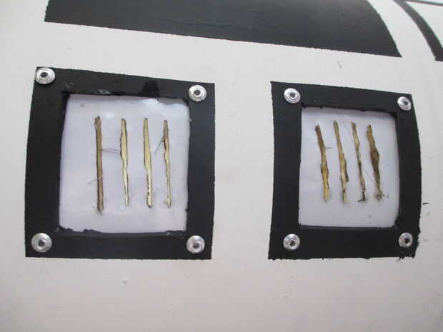 12. luego utiliza una dremel para cortar listones en un pedazo de lata y les clava en el frente como respiraderos.