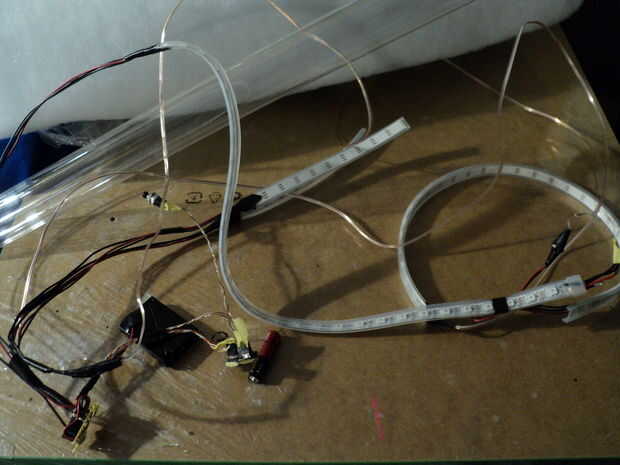Ahora necesita a las tiras de Neopixel a través de los tubos de la serpiente. Alimenté mi cinta métrica por el extremo opuesto primero para poder cinta adhesiva en el extremo de los cables y utilizar para ayudar a tirar a través del tubo. Tienes que comprimir el bateo y empuje que todos tirando a través por lo que ayuda a tener otra persona ayudar. A través de la guía y Oriente los LEDs de Neopixel todo frente en una línea recta. Recuerda suavemente posición que la Neopixel tiras como las conexiones y la franja aún son vulnerables con el alivio de tensión que se intenta construir.