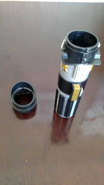 Usando el pegamento, pega el anillo modificado en el lugar en el extremo de la manija y pegar la tapa al otro extremo, esencialmente volver a armar el juguete sin la mitad de la caja.