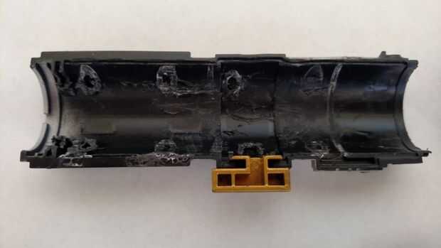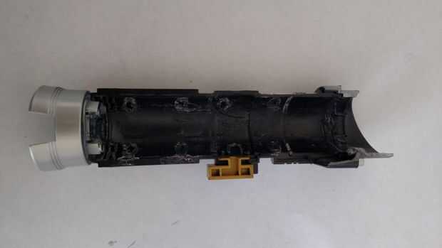 Una vez que ambas mitades están separadas, usé los alicates para quitar el interior estructura del compartimiento de la batería, la luz y el interruptor.