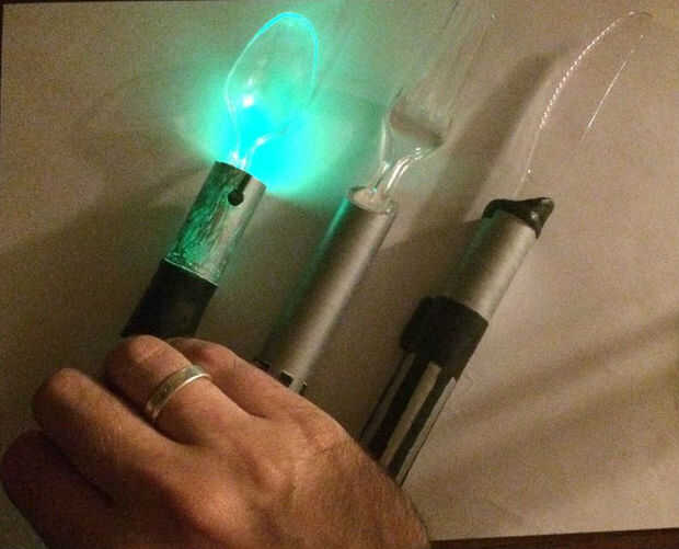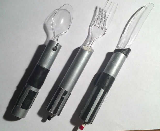 Dry fit el utensilios de plástico con sus respectivas luces para asegurarse de que todo encaja. Luego coloque el utensilio de plástico dentro del tubo de PVC donde quieras y pegamento en caliente. Luego coloque la luz en el otro extremo del tubo y pegamento caliente en. Deje que el pegamento seque y comer los alimentos como un Jedi. Estos no son caja fuerte del lavaplatos. No sería hasta seguros para lavarse las manos. Me encantaría 3D impresión estos algún día. Si haces tu propio post abajo.
