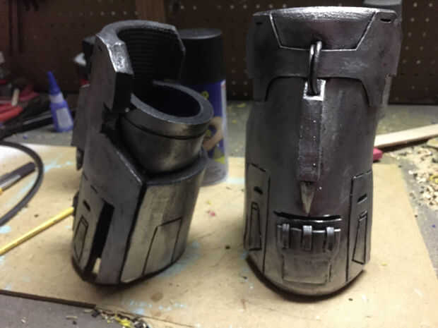 La parte difícil es conseguir la sección inferior de los guanteletes de tamaño correctamente. Ya he hecho de dos pedazos, uno parcialmente dentro del otro en la parte delantera, creó un buen ajuste en mis muñecas. En vez de tratar de añadir una bisagra, acaba de cerrar estos. Hay espacio apenas suficiente para conseguir mi mano, si dar vuelta la pieza hacia un lado para deslizar en. No podía pedir un mejor ajuste.
