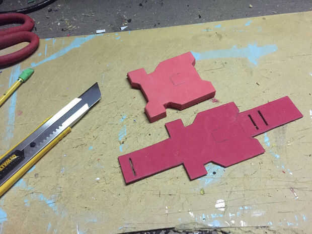 Una vez que hayas hecho esto, cortar tus piezas de hebilla de cinturón, bolsas (he hecho estos de espuma también) y correa -greeble cosa de plata.