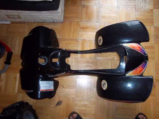 De la tira de todas las etiquetas del cuerpo y Sierra los dos guardabarros delanteros. Suavizan los bordes con un disco de lijado. Con una sierra había perforado dos agujeros en la parte delantera debajo de las barras de la manija. Esto me permitió poner pvc dentro del cuerpo y fijarlo con los tornillos y Alex plus claro. Tras que pinté marrón. Dibujé a mano alzada las formas para el front-end usando algunas fotos para una guía. Entonces triplicaron el tamaño para un impacto visual. Usé la misma pintura marrón para el cuerpo y superficies de sustentación.
