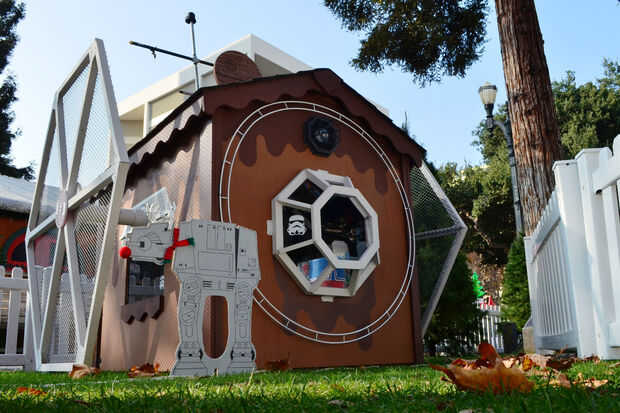 Este año elegimos un tema de Star Wars y elegí la única caza Tie porque era más adecuado para convertirse en un teatro fresco y divertido para los niños. Se basa en un estándar kit Playhouse madera que proporciona CITP con pocas restricciones sobre cómo pueden modificarse o decorado. Puede construir o comprar un kit Playhouse estándar por lo que simplemente estoy describiendo cómo se transformó en un "Tie Fighter". Elegí la mayoría de los materiales de nuestros almacenes. El lado de entrada de la casita cuenta con la dulzura del tema "Únete nosotros en el Chocolate lado oscuro" y "Que tienen las galletas", razón por la cual está pintado un color chocolate con gotas. Las dos características principales de Tie Fighter están el Octagonal (8 lados) Puerto ventana o pabellón piloto y la Hexagonal (5 lados) alas. También hay una luz octogonal lámpara con un LED giratorio "Fiesta Light" y un anillo de metal grande blanco para representar la forma redonda de la original combatiente de la corbata.