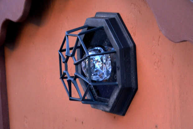 Puede que no desee iluminación para su casita pero ya que esto fue mostrado en un evento de noche y el día de Navidad, hemos añadido luces. He encontrado esta lámpara octagonal que funcionó a la perfección con la ventana octogonal. Era para representar la pistola laser. Al principio iba a la Monte dos debajo de la ventana, Miró y llenaron el espacio mejor por encima y por debajo del máximo de la azotea. No cabe nuestro nuevo giratorio multicolor fiesta bombilla, así que tuve que modificarlo. Quité el portalámparas, Monte y perforó un agujero de 3". Entonces montara una lámpara en un soporte en L detrás así que salía a la mitad el agujero. Era muy brillante por la noche por eso me instaló el vidrio esmerilado que produce un agradable brillo de colores.