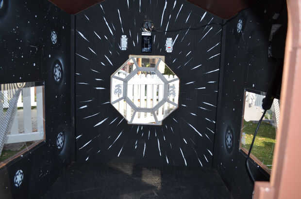 El interior fue pintado negro con vetas radiales estrella en la ventana para simular Hyper velocidad y copos de nieve Tie Fighter pintadas a mano cortar las plantillas. Espero que usted encontró este Instructable inspirador y útil, he intentado subir más fotos pero vinieron en negro.