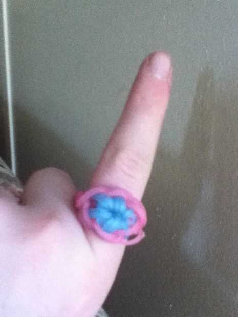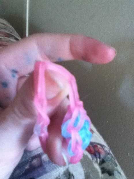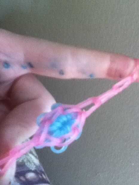 Hacer una cadena fuera del agujero donde estaba el dedo. Utilice las restantes bandas de goma. Si al pequeño cuando se pinza los extremos juntos añadir más. Si es grande para algunos sacar.