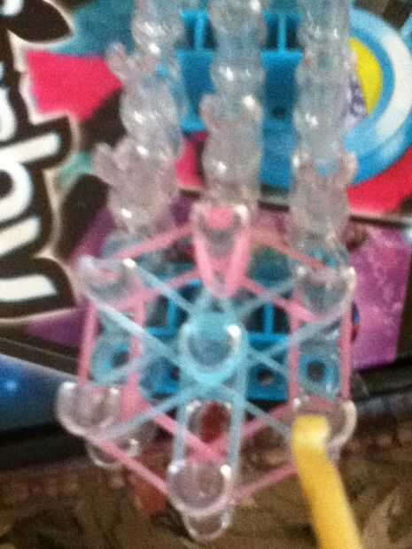 Tire el azul (cualquier color está usando debajo de la rosa banda para envases) y llevarlo hasta la mitad con el gancho.