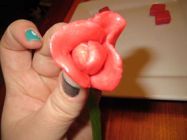 lindo, fácil, rápido y delicioso!ALIMENTOS-Magdalena-helar-starburst rojo (o caramelo de anyother usted puede aplanar y molde)-gota de goma verde (o su elección)-azúcarHERRAMIENTAS-tablero de corte-cuchillo pequeño-perno de balanceoROSAS-1-2 starburs