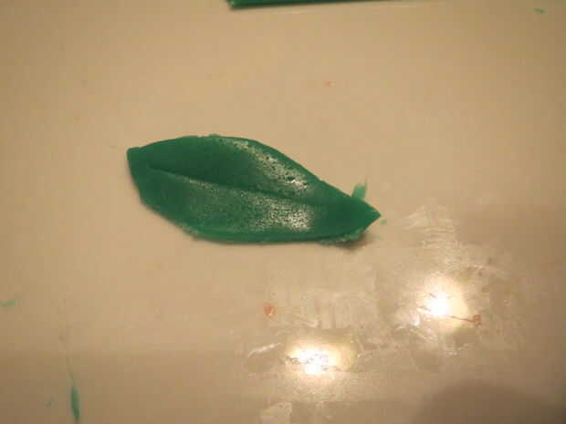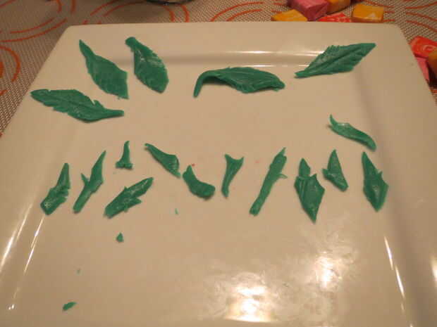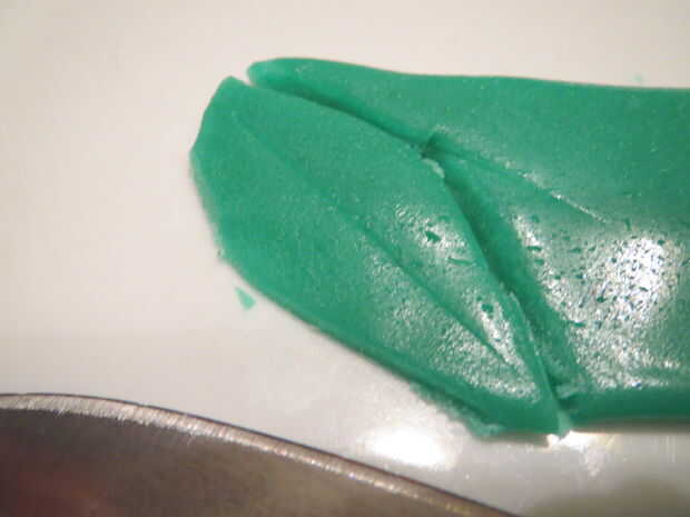 Comience por cortar el extremo en diagonal o por lo menos dos cortes que forman un ángulo obtuso y repetición la forma de la hoja en el otro lado. Marcar el centro y corte pequeñas ranuras en los lados de los bordes. Por último, meter puntos pequeños en la superficie de la hoja.