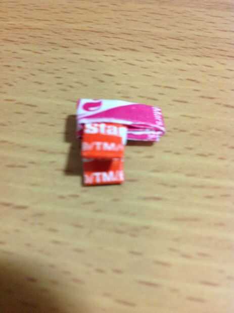 usted puede hacer fácilmente una cadena de contenedores starburst o goma de mascar. Estoy usando envolturas starburst desde hoy comí algunos, pero goma envolturas trabajo igual de bien.Acabo de hacer una cadena de un paquete de destellos, pero si tie