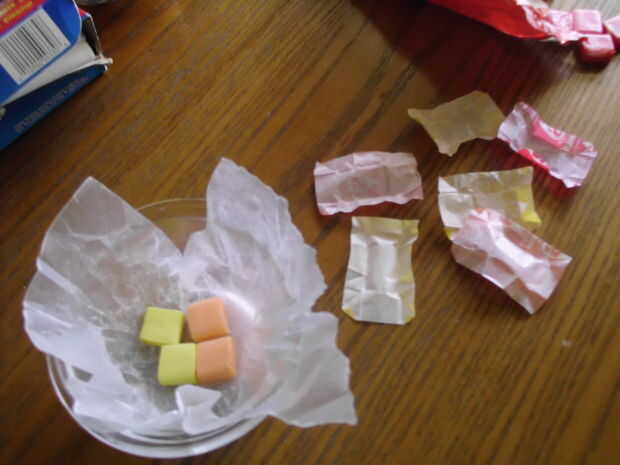 No tienes que hacer esto, pero es más fácil. Consigue un trozo de papel encerado y ponga en el recipiente. Poner destellos sin envolver en la parte superior. El papel de cera hace más fácil sacar los caramelos.