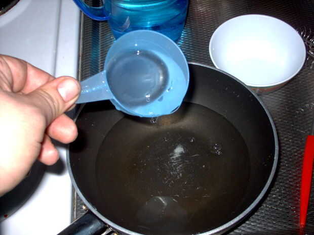 Estera de la upp 4 dl vatten med i kastrullen.