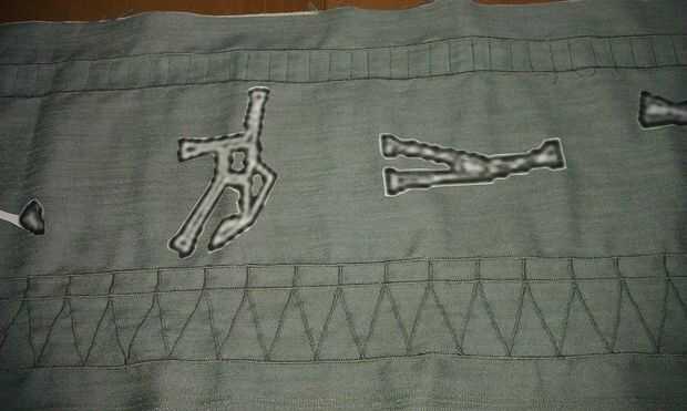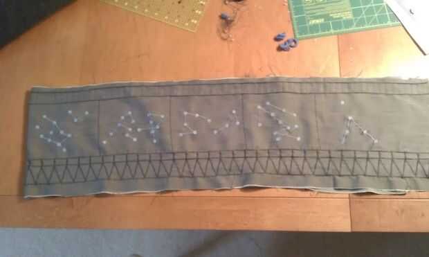 4. Mida sus secciones de símbolo de la puerta usando las medidas del patrón de diseño. Se desea incluir de 1 a 3 coser las líneas como una frontera entre sus glifos. Trazar sus símbolos en cada sección y coser en. (Para el Puerta de Atlantis, utilice la puntada de apliques y poner todo de su circular "estrellas")